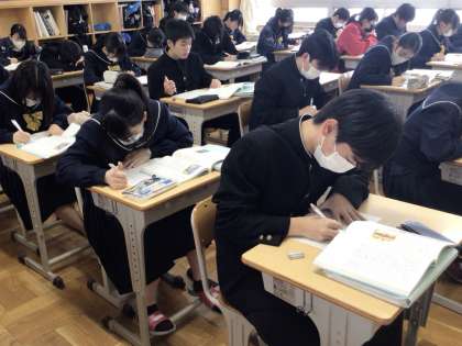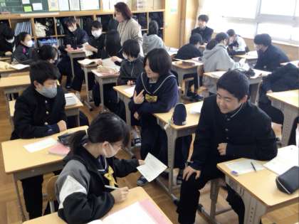 1年生の技術の授業では、木材加工の学習を行っていました。本格的に板を切ったり磨いたりという作業に入り始め、ノコギリや工作機械を扱っています。使い方の指導を受けてから作業をしていますが、ノコギリを使い慣れていない生徒が多く、手間取っている場面をよく見かけました。これも良い経験です。2年生の英語の授業では、受け身の学習を行いました。様々な動詞の過去分詞を確認しながら、各自が受け身の英文を考え、ペアでクイズを出し合っていました。クイズ形式ということもあり、より楽しい雰囲気で対話に取り組んでいました。3年生の国語の授業では、随筆の学習を行っていました。国際社会における人との関わりについて著された文章をじっくりと読み込み、著者の考えを読み解いていました。文章の読解に留まらず、これからのことを考えるきっかけにもなるものでした。