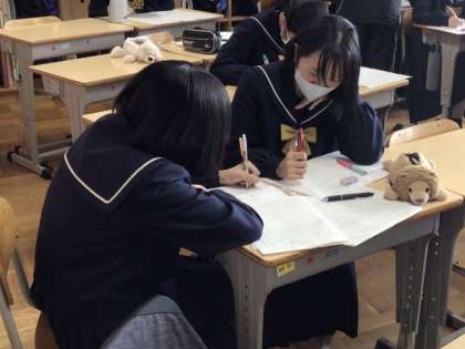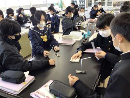 20日(月)、1年生の数学の授業では、問題演習に取り組んでいました。来週行われる学習診断テストに向けて、過去に出題出題された問題にチャレンジした後、見直したり、友達や先生に教えてもらったりしてしっかりと復習していました。中学入学後の学びを振り返る良い機会にもなっています。2年生の理科の授業では、静電気の学習を行っていました。ペアで簡単な実験装置を組み立て、ストローとテッシュペーパーで静電気を発生させていました。ストロー同士を近づけると反発する様子が見られて、みんなからは「おーっ!」と歓声が上がって盛り上がっていました。印象強く残って原理もよく理解できると思います。3年生の社会の授業では、地球環境の学習を行っていました。実際に行われた地球サミットにちなんで、班で先進国と途上国の立場に分かれて、温室効果ガス削減について意見交流を行っていました。相手の立場や考えを理解しながら、どのように折り合いをつけたら良いのかを考えることも大切にしていましたので、仲間の意見に耳を傾けている姿が見られました。