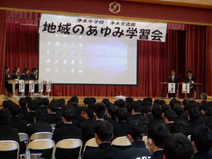 4日(火)『地域のあゆみ学習会』が開催されました。本校からは1、2年生が参加しました。また、地域の方も参加していただき、開校・開館当時を振り返ったり、どのような想いがあって、中学校と交流館が合築されたのか等について学んだりしました。講師として、開校に携わった市役所の方や地域の代表の方をお招きし、それぞれの立場からお話をいただきました。