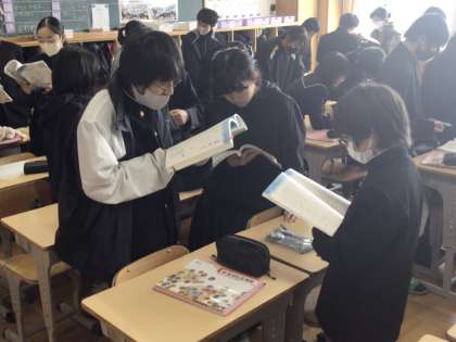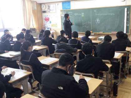 18日(火)、1年生の国語の授業では、随筆の学習を行っていました。音読を通して情感を表す語句や表現に着目して語感を磨いていました。さらに、文章中の表現や言葉から筆者の考えを読み解き、グループや学級全体で意見交流していました。2年生の数学や英語、理科等の授業では、学年末テストの解説や見直しを行っていました。先生の解説や模範解答で確認しながら、間違えた問題の見直しをしたり、友達同士で教え合ったりしていました。