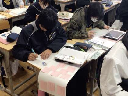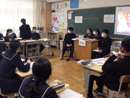 3日(月)、1年生の国語の授業では、随筆の学習を行っていました。自分が随筆に表したいことをまずは付箋に書き出してワークーシートに貼り並べ、どのような構成にしようかと順番を張り替えていました。自分になりに構成がまとまった人は原稿用紙に書き始めていました。じっくりと文章を書く機会は貴重です。頑張って書き上げてほしいと思います。2年生の国語の授業ではディベートの学習を行なっていました。今日はディベート本番で肯定派、否定派、進行や審判等の役割分担をして本格的に行っていました。時間内に上手に自分たちの論をまとめて力強く説明したり、相手の意見に対する考えを班の仲間と素早く話し合って反論したりと、非常に活気があって見応えのあるやり取りでした。実社会でも役立つ大切な機会だと感じました。3年生は学年全体で最後の思い出づくりの球技大会を行っていました。久しぶりにクラスTシャツを着てクラスの団結力を感じながら大変盛り上がっていました。みんなとても笑顔で楽しんでいるのが印象的でした。