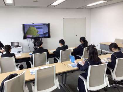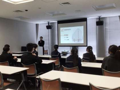 企業訪問の様子です。生徒の皆さんは緊張しながら真剣に企業の方の説明を聞いています。写真は東海テレビ、名古屋証券取引所、コメ兵での様子です。