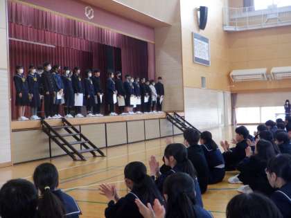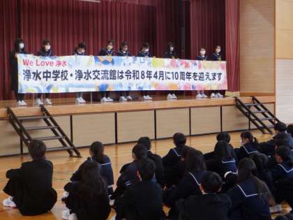 24日(月)各種表彰と令和7年度前期生徒会役員の認証、修了式を行いました。表彰では、部活動や応募作品等で多くの生徒が活躍し、たくさんの賞が披露され、皆で称えました。また、来年度浄水中学校・浄水交流館が10年目を迎えることを受け、美術部の皆さんが作成してくれた横断幕も披露されました。