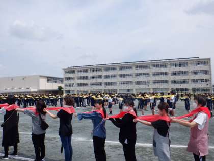 本日、10周年記念事業の一つとして、全校生徒で航空写真を撮影しました。自分たちの担当場所でスタンバイし、タイミングを合わせてカラーエプロンを広げ、セスナ機が上空旋回しながら無事撮影しました。事前に地域の方へも呼び掛けていたため、当日は約50名の保護者や地域の方にも参加いただきました。