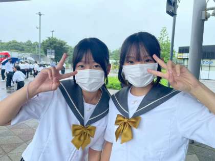 傘が必要な程度の雨模様です。少し肌寒い感じですが、生徒はとても元気です。