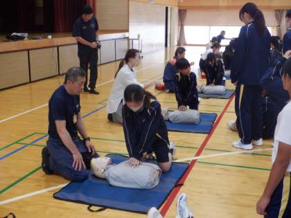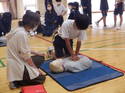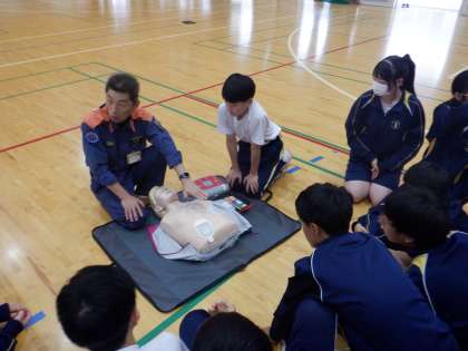 11日(水)2年生が心肺蘇生講習を受講しました。実際にモデルの人形に対し胸骨圧迫のマッサージを実施しました。テンポは1分間に100〜120回、深さは5cm程度押し込むことなどを学びました。次に代表生徒によるAEDの使い方を学びました。