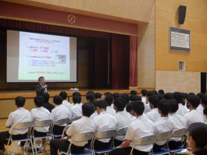 26日(木)3年生に対し、私立高校・専修学校説明会が行われ、県内より関係校の先生方にお越しいただきました。その中で、各学校の魅力や特長、力を入れていることなどについてくわしくお話しいただきました。