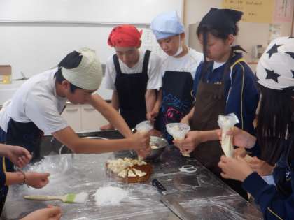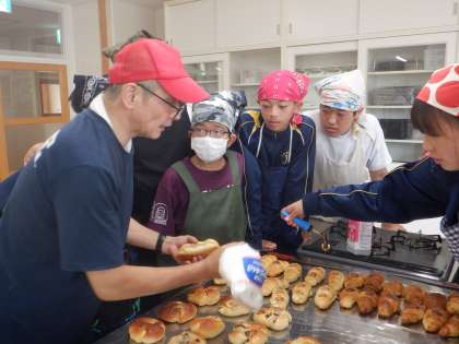 2年生ではサンクス洋菓子店さんとコラボしており、今日は試作品を一緒に調理していました。タルト生地にクリームを絞ったり、こしあんパンやクリームパンに「すいりゅーちゃん」の焼印を押したりしながら作品の完成を目指していました。りんごを煮詰めてゼリーを作ったり、抹茶をぜいたくに使ったロールケーキを作ったりと、自分たちのアイデアが形になるすばらしさを感じながら商品化に向けて準備しています。このように生徒の学びを支えていただけることは、とてもありがたいです。