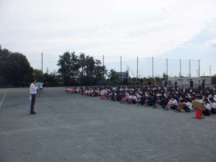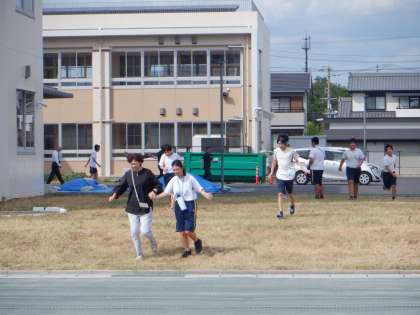 今回は、大地震が起き、建物の倒壊が心配されるために運動場に避難するという想定です。また、「シェイクアウト訓練」もあわせておこない、体を低くして身の安全を確保するなど、教室内でも自分の体を守る行動を意識しました。