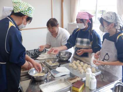 11日(木)2年生のクラスでまごフェスへの出店に向けた下準備が行われました。このクラスでは内藤精肉店さんを講師にお招きし、料理の仕込みを行っていました。本時はコロッケ作り。タネをきれいに丸め、卵とパン粉をつけて整えていきます。