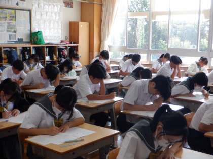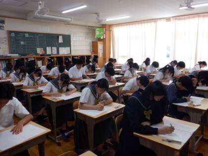 2日(木)3年生で第2回学習診断テストが行われました。国・数・社・理・英の5教科で、英語は筆記と聞き取りが行われました。3年生の生徒の皆さんは、ピリッとした緊張感のある空気の中、真剣に問題に取り組んでいました。皆さんの実力が出し切れるとよいなと思います。