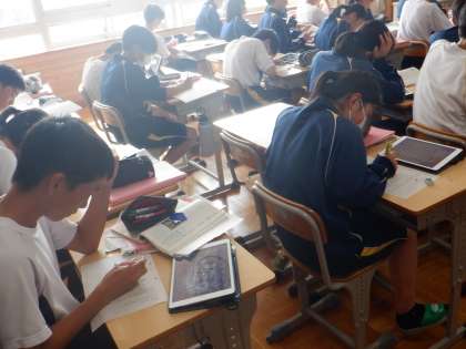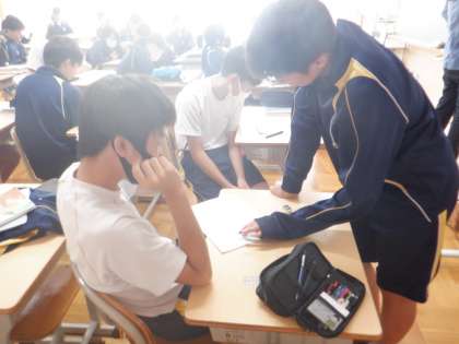 7日(火)の授業の様子です。1年生の体育では、柔道の学習が行われました。中学校の授業では、実際に組んで投げ合うような学習はしませんが、畳の上で受け身をとる練習を行っていました。慣れない武道の練習ですが、ポイントを確認しながら「バンッ!」と力強く受け身をとっていました。2年生は国語の説明文の学習。筆者の主張に対する自分の意見を記述する中で、表記の仕方に気を付けながら文章にまとめていました。3年生は、先日行われた学力診断テストの解説が行われていました。教師による解説に加え、友達同士で教えあう姿がありました。間違えた問題を確実にフォローすることで、同じ間違いを防ぐことができるので、この時間も大切にしたいですね。