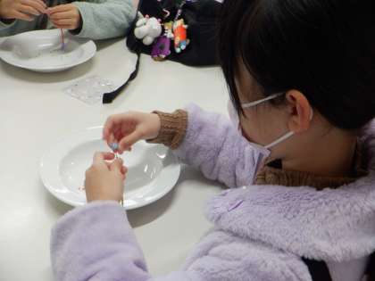 家庭部では、小さなビーズをワイヤーに通してブレスレットを制作しました。とても細かい作業でしたが、中学生が通し方のコツや色合いのバランスなどについて助言しながら、丁寧に作ることができました。小学生の皆さんも、とてもステキなお土産ができてうれしそうでした。