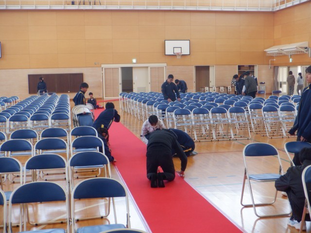 5日(木)、2年生が明日の卒業式に向けて一生懸命準備をしました。式場や廊下、各教室など卒業生が中学校生活最後の一日の思い出になるように、丁寧に整えました。