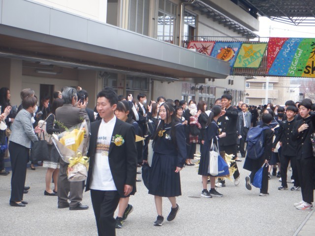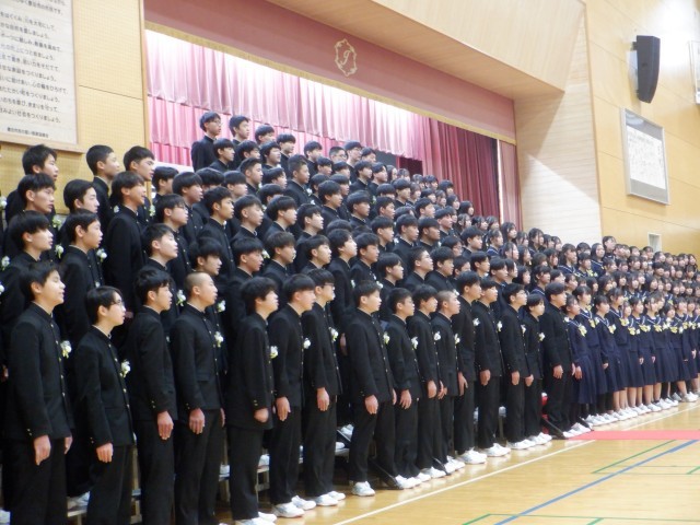6日(金)厳かな雰囲気の中、保護者の皆様、来賓の皆様、在校生の2年生、それから教職員が見守りながら、卒業生が堂々と式に参加しました。式後は各学級で最後の時間を過ごし、仲間との名残を惜しんでいました。最後は、2年生と教職員による門出送りを行い、246名の卒業生が中学校を巣立っていきました。