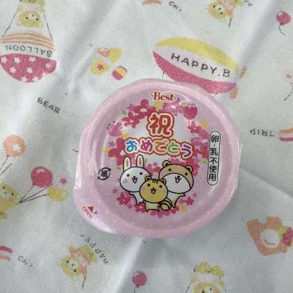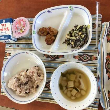 今日の献立は、赤飯、ふだま汁、ひじきサラダ、ごまつくね、いちごゼリー(豆乳クリーム添え)、牛乳でした。