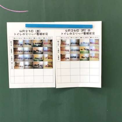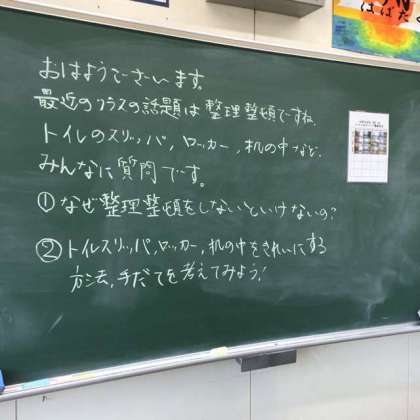 3年生の教室には、最近、トイレのスリッパに関する話題が黒板に書かれています。