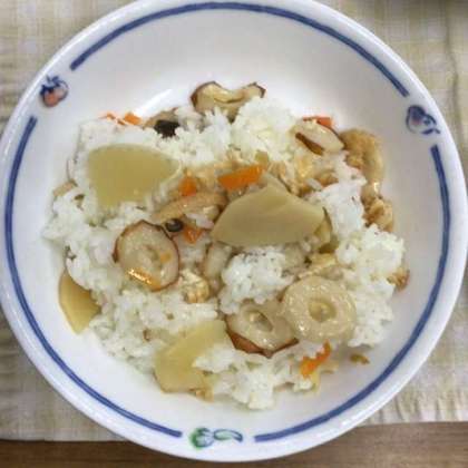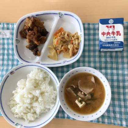 今日の献立は、ごはん、みそ汁、たけのこ混ぜごはんの具、レバーとじゃがいもの甘辛煮、牛乳でした。