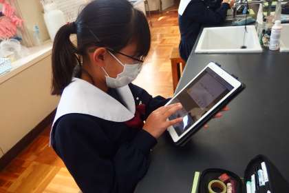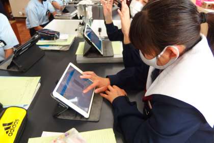 考察結果をタブレット上に記しています。
