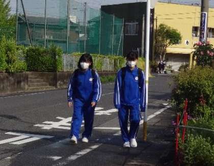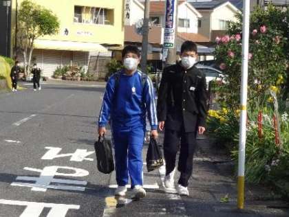 複数で登校する生徒は、マスク登校を実践しています。