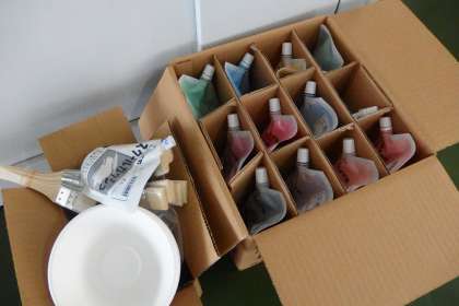 体育祭に向けて製作中の学級旗を塗るための 絵の具、刷毛、塗り皿の3点セット