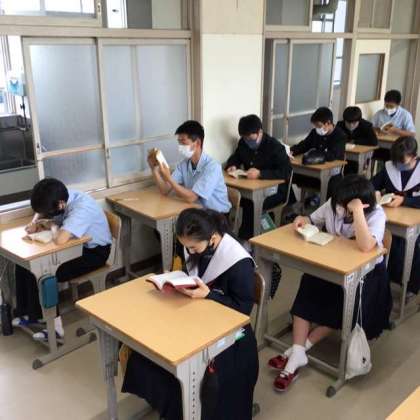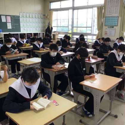今朝の上中タイム。静かに読書に集中する3年生の様子です。