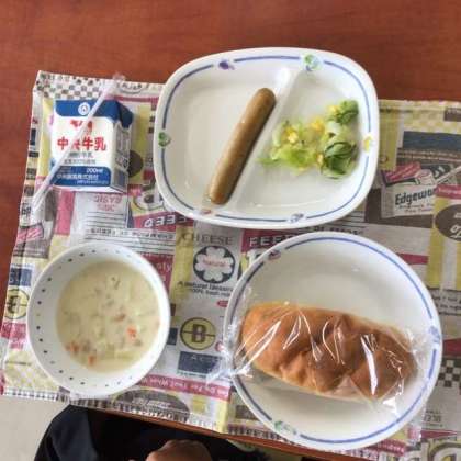 今日の献立は、米粉パン、お豆のポタージュ、コーンサラダ、ウインナー、牛乳でした。