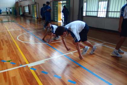 体育館でスタートダッシュの練習をしていました。