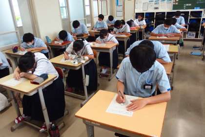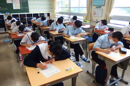 3年生の英語の授業です。 ライティングテストに挑戦中です。