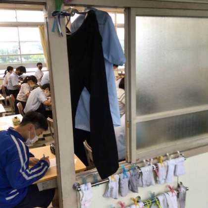 教室を回っていると、雨に濡れた制服を干している場面もありました。