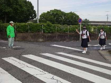 月曜日の朝に決まって正門に立ってくださる地域のボランティアの方が、次の月曜日が代休日のため、今朝、正門に立ってくださいました。