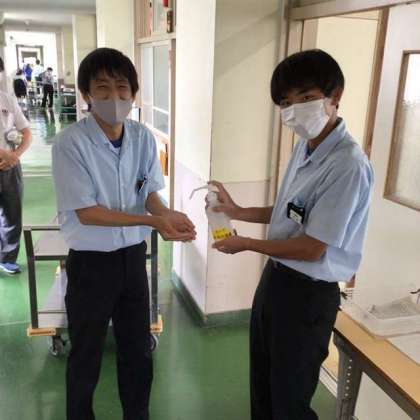 廊下で消毒液を手に、手洗いを終えた生徒を待つ生徒。