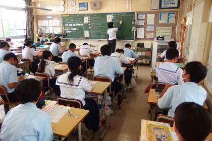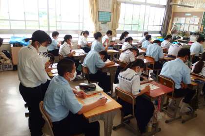 3年生の家庭科の授業です。 教育実習生が参観しています。