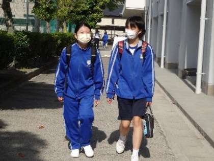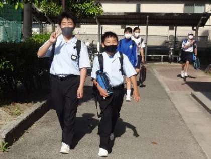 写真は正面からの朝日を浴びながら登校してくる、眩しそうな生徒の様子です。