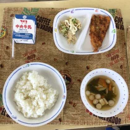 今日の献立は、ごはん、ふだま汁、とり肉のごまマヨサラダ、にぎすフライ、牛乳でした。