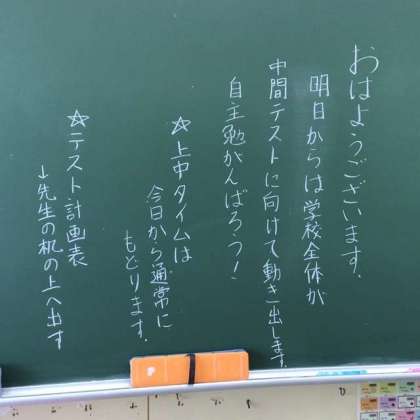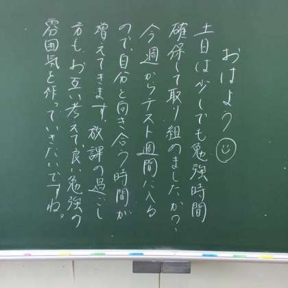 教室の黒板には、テストに向けての頑張りを期待する、担任の先生からのメッセージが書かれていました。