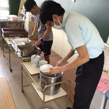 ある学級では、担任の先生と学年主任の先生が、配膳作業に取り組んでいました。