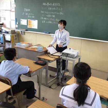 担任の先生に代わって、教育実習生が生徒の前で話をしていました。