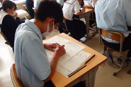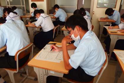前期中間テスト1日目のテストに向かう 真剣な表情の3年生です。