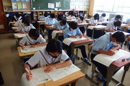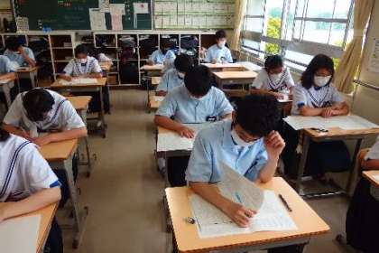写真は、前期中間テストに臨む生徒の姿です。