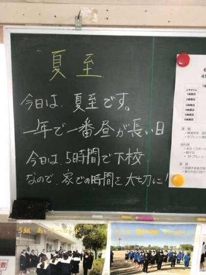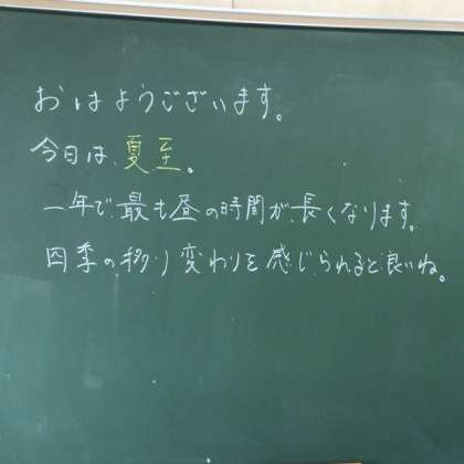 教室や学年職員室の黒板にも、今日が「夏至」であることを告げるメッセージが書かれていました。