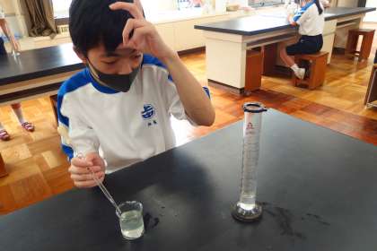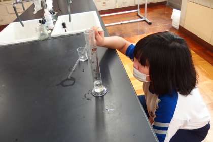 真剣に目盛りを読んでいます。