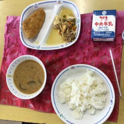 今日の献立は、ごはん、夏野菜のごまみそ汁、ゴーヤチャンプルー、あじフライ、牛乳でした。