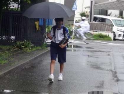 雨が弱まった中での登校 〜今日の登校風景1〜