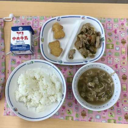 今日の献立は、ごはん、七夕汁、ピーマンと豚肉の炒め物、いかナゲット、牛乳でした。