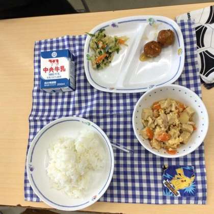 今日の献立は、ごはん、高野豆腐の卵とじ、アーモンドあえ、ごぼう入りつくね、牛乳でした。
