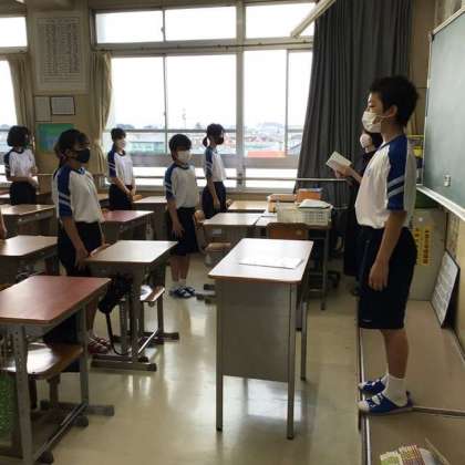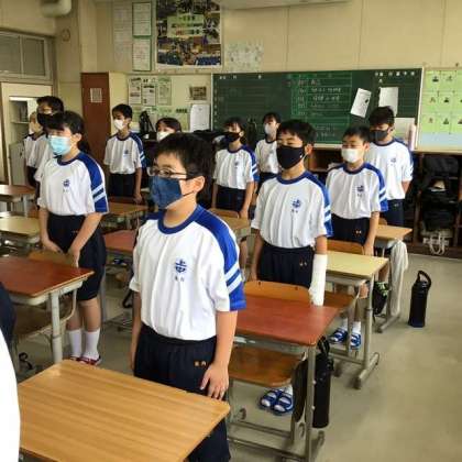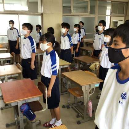 これまで、授業開始・終了のあいさつ、給食や清掃時のあいさつなどは、声を出さず、礼をするだけにしていましたが、12日からは発声を伴うあいさつに変えました。