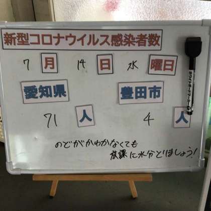 校舎内、各学年の職員室前には、暑さ指数を示す温度計と、保健委員会による前日のコロナウイルス感染症の人数を示すホワイトボードが設置されています。