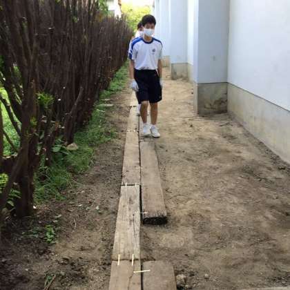 このたび、弓道部顧問の知り合い(弓道でつながるお仲間)の業者の方が、ご厚意で不要になった枕木などを活用して、矢取り道の整備をしてくださいました。