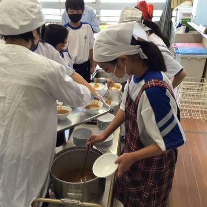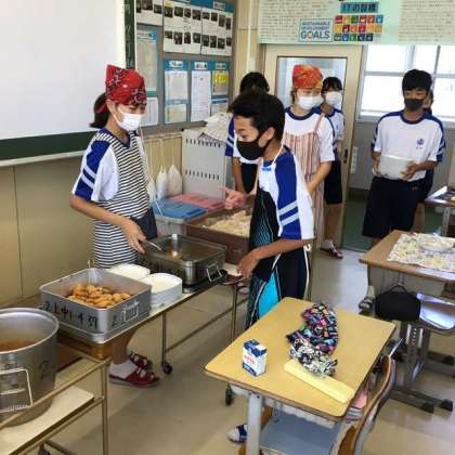 今週は学校のエプロンは使わず、マイエプロンで配膳をします。